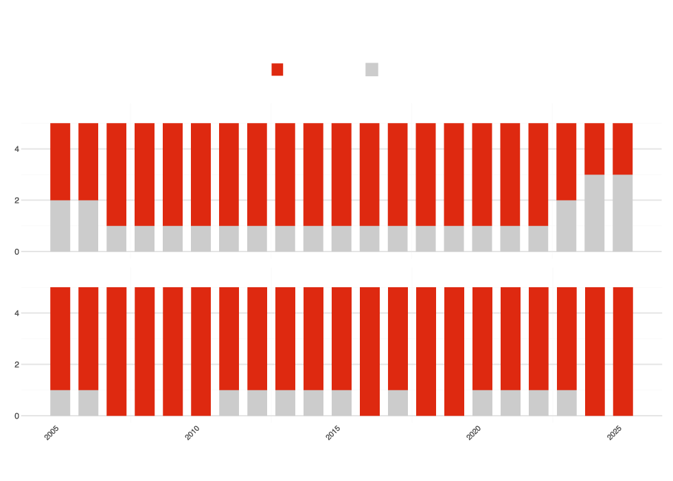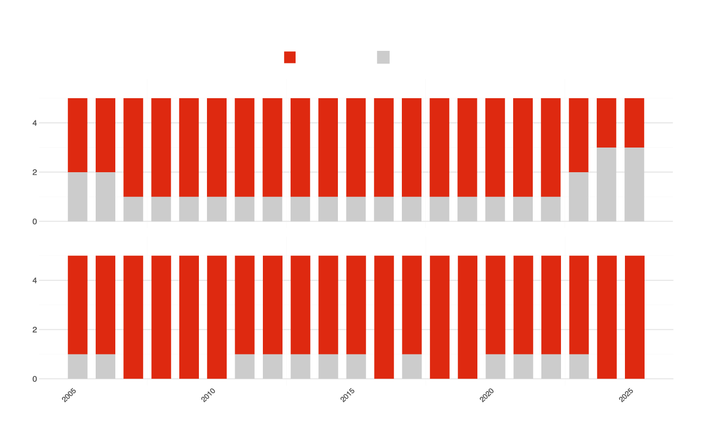 Looking back to the waffle chart, the women's doubles chart is almost entirely orange. It has been that way for a decade, and there is little reason to think it will change. The men's doubles chart is a different picture. Color is creeping in from the edges. Hong Kong in 2022, France in 2025, Korea and Japan filling in the gaps year by year.